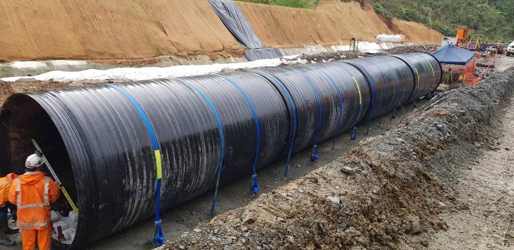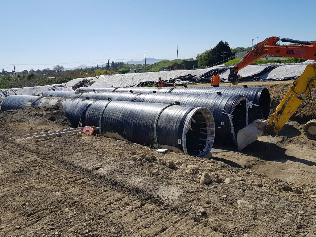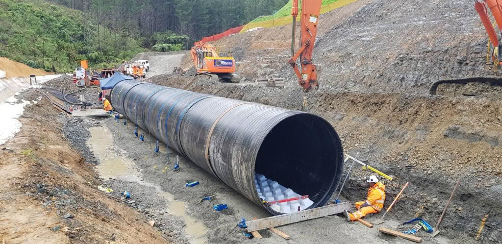 On the project, there were six major culverts that were designed to the NZTA Bridge Manual and required an FEA (Finite Element Analysis) modelling to be carried out on each individual pipe section to determine selection of the correct Stiffness Nominal (SN) class for pipes that were installed. The culverts are installed near many earthquake fault lines, and at varying depths, the culverts are required to support the earth structure and State Highway constructed directly above.
